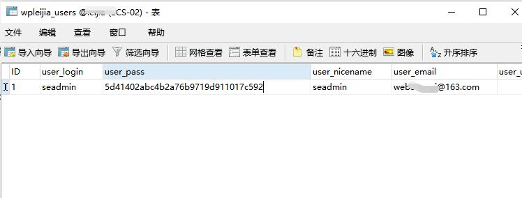在数据表管理界面,找到 wp_users 名称的数据表,然后编辑,进行新密码的重置。不过通过数据库中都是进行数据MD5加密编译过的,可以直接把对应的 将user_pass值改成:5d41402abc4b2a76b9719d911017c592 。然后重新登录后台密码是 hello