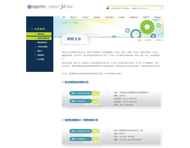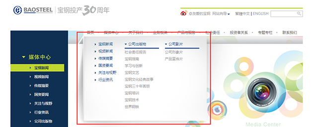 宝钢官网导航背景色采用与logo色一致的蓝色,除了banner图的红色,内页的整体颜色搭配看起来比较舒适。
