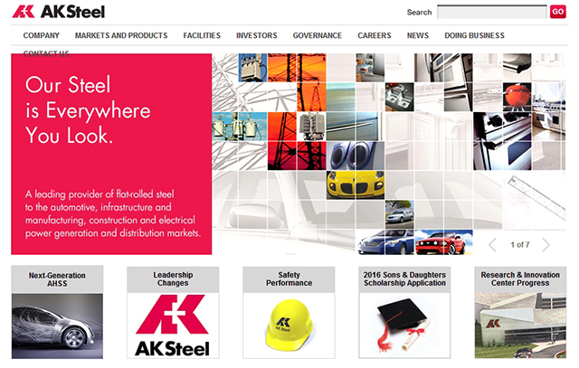 众多钢铁公司的网站主色采用了蓝色系,AK钢铁公司网站则显得与众不同。AK钢铁公司网站采用了玫红色,是由于其logo是玫红色。
