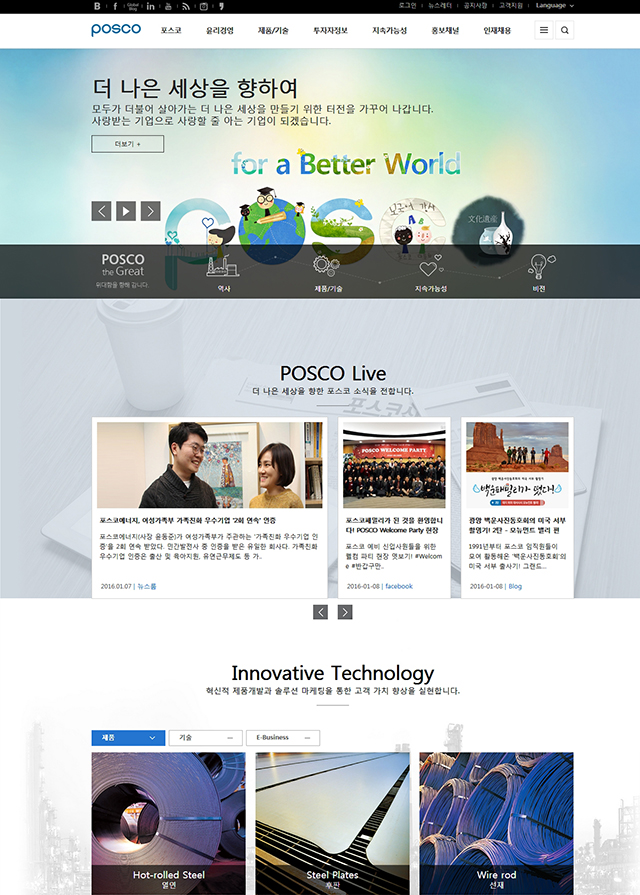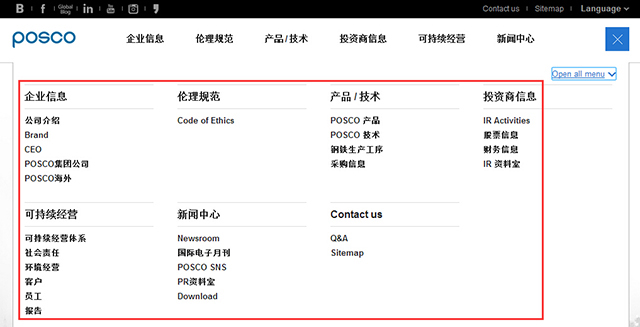 浦项制铁公司的官网是一个响应式网站,网站的首页以全屏滚动方式展现内容。