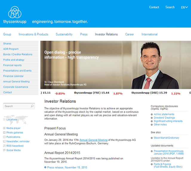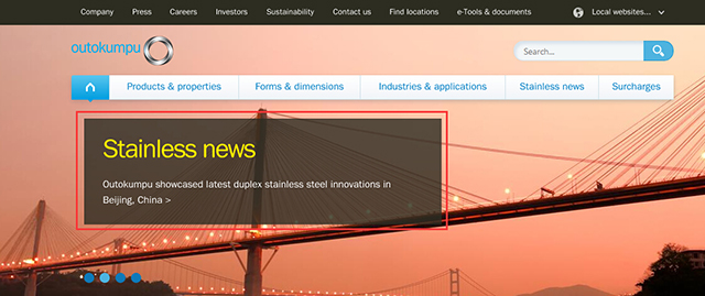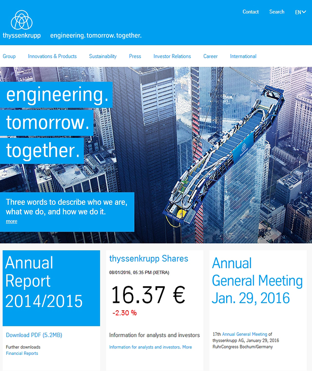 蒂森克虏伯官网属于典型的扁平化风格,网站设计展现了一种鲜明的“科技感”,Banner中的图、蓝色的色块和大号文字搭配起来富有吸引力,能在第一时间抓住人的眼球。