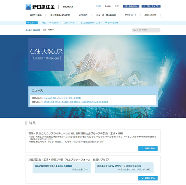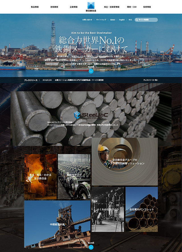 新日铁住金是钢产量世界第二的公司。该网站的Banner图和大号文字搭配,具有视觉冲击力。